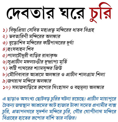 ২০১২ সালের মাঝামাঝি থেকে একটানা আট মাস শহরের বিভিন্ন মন্দিরে একের পর এক চুরি হয়েছিল। কোথাও বিগ্রহ, কোথাও অলঙ্কার তো কোথাও প্রাচীন মন্দিরের মূল্যবান স্মারক। শেষে রুপোর আস্ত সিংহাসন লোপাট করে দেয় চোরেরা। ২০১৩-র জানুয়ারির শেষে এক সপ্তাহের ব্যবধানে পরপর তিনটি মন্দিরে বড় মাপের চুরি হওয়ায় হুলুস্থূল পড়ে যায়। বাড়ে পুলিশি তৎপরতা। তার পর থেকে বছর তিনেক মঠ-মন্দিরে চুরির ঘটনা বড় একটা ঘটেনি।