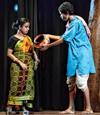 বহরমপুরে স্কুলস্তরের নাটক প্রতিযোগিতায় ‘মুড়কির হাঁড়ি’ নাটকের মুহূর্ত। — নিজস্ব চিত্র।