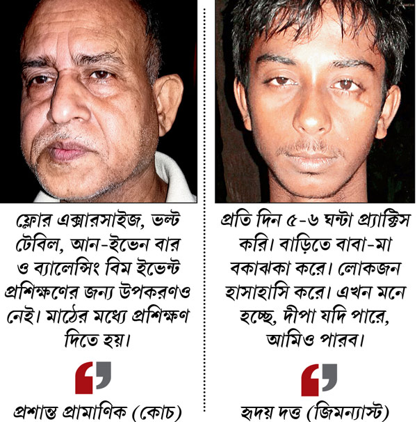 বহরমপুর গাঁধী কলোনির ইটের গাঁথনি দেওয়া টালির ছাউনির নিচে ঘুপচি ঘরে বেড়ে ওঠা হৃদয় দত্ত যেমন। জিমন্যাস্টিকসে তার আগ্রহ সেই চতুর্থ শ্রেণি থেকে। এখন সে প্রথম বর্ষের ছাত্র। বাবা হারাধন দত্ত লালদিঘি পাড়ায় বড় রাস্তার ধারে ঠেলাগাড়িতে সকাল থেকে দুপুর রুটি-তরকারি বিক্রি করেন। অন্ধকার থাকতে উঠে পড়ে বহরমপুর ব্যারাক স্কোয়ার ময়দানে একা জিমন্যাস্টিকস প্র্যাকটিস করে চলে হৃদয়। বেলা বাড়লে বাবাকে সাহায্য করতে ছুটতে হয়। বিকেলে বিবেকানন্দ ব্যায়াম সমিতি ক্লাবে গিয়ে প্রশান্তবাবুর কাছে পাক্কা ৩-৪ ঘণ্টা অক্লান্ত পরিশ্রম। ‘‘এত খাটে, কিন্তু পুষ্টিকর খাবার ওকে আমরা দিতে পারি না’’— আক্ষেপ বাবা হারাধনবাবুর। তাঁরাও তাকিয়ে আছেন দীপার দিকে।
