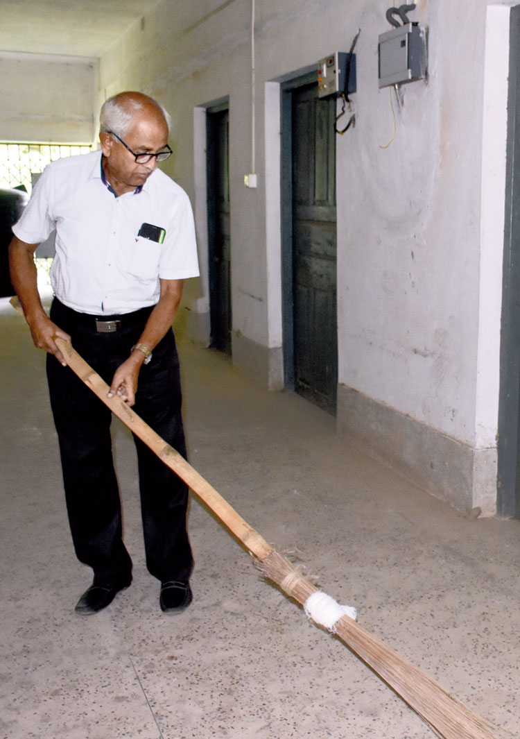 ঘড়ির কাঁটায় সকাল ন’টা। বাইরে থিকথিক করছে রোগীর ভিড়। চিকিৎসক আসবেন একটু পরেই। ঠিক তখনই গটগট করে স্বাস্থ্যকেন্দ্রে ঢুকলেন এক প্রৌঢ়। চোখে কালো ফ্রেমের চশমা। পরনে সাদা শার্ট, কালো প্যান্ট। বুকপকেট থেকে উঁকি মারছে স্মার্ট ফোন। আর হাতে একটা পেল্লাই ঝাঁটা!