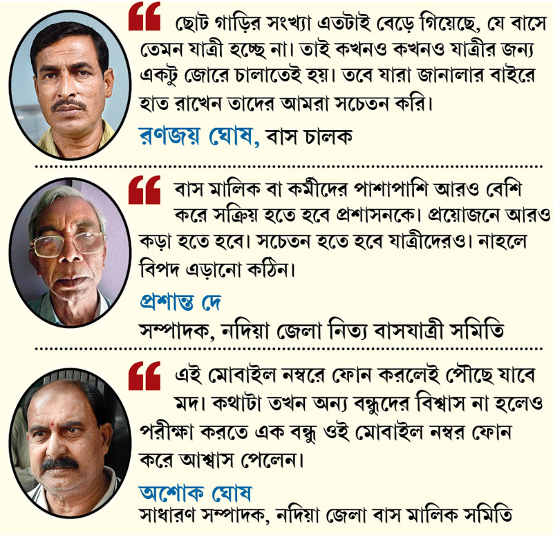 মুর্শিদাবাদের এক শিক্ষক ছোটন ঘোষ নিয়মিত কান্দি থেকে সালার যাতায়াত করেন। তাঁর কথায়, ‘‘কান্দি বাসস্ট্যান্ড থেকে বাসগুলি সময়ে ছাড়ে। কিছুটা এগিয়ে দোহালিয়া বাইপাশে যাত্রী থাক বা না থাক প্রায় পাঁচ মিনিট দাঁড়িয়ে থাকে। তারপর ভরতপুর পর্যন্ত প্রায় ১৪ কিলোমিটার রাস্তা বাসের গতি থাকে খুবই কম। কিন্তু ভরতপুরের পর থেকে বাস উড়তে শুরু করে। এটা বন্ধ হোক।’’