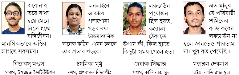 পরীক্ষা শেষের ১৩৯ দিনের মাথায় করোনা আবহেই প্রকাশিত হল চলতি বছরে মাধ্যমিকের ফলাফল। আর তাতেই জেলার জয়জয়কার। মধ্যশিক্ষা পর্ষদ প্রকাশিত মেধাতালিকায় রাজ্যের মধ্যে প্রথম দশে জেলার চার জন কৃতী পড়ুয়া স্থান পাওয়ায় খুশি জেলার শিক্ষকেরা। মধ্যশিক্ষা পর্ষদের মেধা তালিকা অনুযায়ী পাঁচ জন পড়ুয়া পঞ্চম স্থান পেয়েছে। তাদের মধ্যে বহরমপুর গোরাবাজার ঈশ্বরচন্দ্র ইন্সটিটিউশনের ছাত্র বিভাবসু মণ্ডল এক জন। তার প্রাপ্ত নম্বর ৬৮৮। রাজ্যের তালিকায় সপ্তম স্থানে আছে সতেরো জন পড়ুয়া। তাদেরই এক জন কান্দি রাজ হাইস্কুলের ছাত্র দেবাক্ষ সিদ্ধান্ত। তার প্রাপ্ত নম্বর ৬৮৬। মাত্র এক নম্বর কম পেয়ে রাজ্যের নিরিখে অষ্টম স্থানে রয়েছে বহরমপুর জে এন অ্যাকাডেমির ছাত্র মহাঞ্জন দেবনাথ। মহাঞ্জন ছাড়াও ওই স্থানে রাজ্যের আরও দশ জন পড়ুয়া আছে। দশম স্থান দখল করেছে রাজ্যের ২৩ জন পড়ুয়া। তাদের মধ্যে একজন বেলডাঙা প্রণব বিদ্যাপীঠের ছাত্রী চয়নিকা মুর্মু। চয়নিকা মেয়েদের মধ্যে জেলায় প্রথম স্থান পেয়েছে।