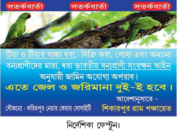 বন দফতরের অবশ্য এ ব্যাপারে কোনও হেলদোল নেই বলেই মনে করছেন স্থানীয় গ্রামবাসীরা। করিমপুরের একটি প্রকৃতিপ্রেমী সংগঠনের শেখর মণ্ডল জানান, বহু বার অভিযোগ জানিয়েছেন তাঁরা। তবে, নির্বিকার গলায় বনকর্মীরা জানিয়েছে, ‘লোক কোথায়, কাকে পাঠাবো!’। এ বার তাই নিজেরাই নেমেছেন টিয়া-পাচার রুখতে।