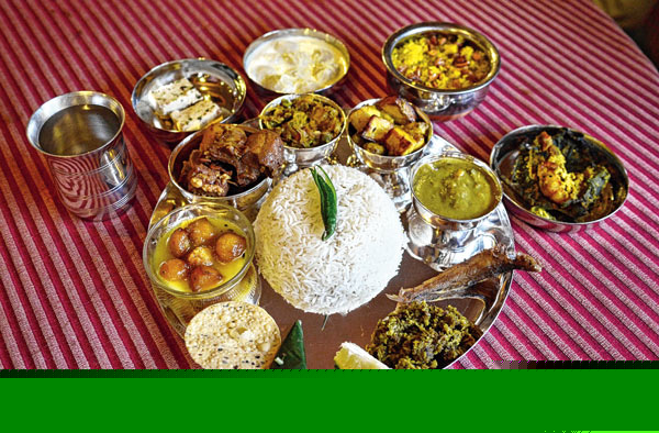 রুপোর গ্লাসে জল। পাশেই প্রমাণ মাপের রুপোর থালায় চুড়ো করা বাসমতী চালের সুগন্ধি ভাত। সঙ্গে মান বাটা, সোনামুগের ঘন ডাল আর প্রমাণ সাইজের তোপসে ভাজা। থালা ঘিরে মানানসই রুপোর বাটিতে পরপর সাজানো লাউপাতায় মোড়া চিংড়ির পাতুরি অথবা কলাপাতায় মোড়া ভেটকির পাতুরি। বাসন্তি পোলাও, খাসি অথবা মুরগির মাংস। মুগডালের বড়ার চাটনি, পাঁপড়। শেষপাতে রসগোল্লার পায়েস আর সরপুরিয়া। তার পর ডাবরে সাজানো সুগন্ধি পান।