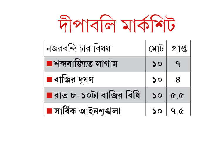আদালতের নির্দেশ ছিল, বাজি পোড়াতে হবে রাত ৮ থেকে ১০টার মধ্যে। তার আগে বা পরে পোড়ানো যাবে না। সেই নির্দেশকে কিন্তু আমল দেননি অনেকেই। সন্ধে থেকেই বাজি পোড়ানো শুরু হয়েছে, চলেছে অনেক রাত পর্যন্ত। প্রায় সর্বত্রই পুলিশের গাড়ি টহল দিয়েছে ঠিকই। বিভিন্ন এলাকায় সিভিক ভল্যান্টিয়ারদেরও মোটরবাইক নিয়ে চক্কর দিতে দেখা গিয়েছে। কিন্তু বেশির ভাগ ক্ষেত্রেই পুলিশের গাড়ি চলে যেতেই ফের শুরু হয়েছে বাজি পোড়ানো। রাত ১০টার পরে শেল ও শব্দবাজির উৎপাত বরং বেড়েছে। বিশেষত জেলার দক্ষিণে— রানাঘাটে, ধানতলায়, চাকদহে।
