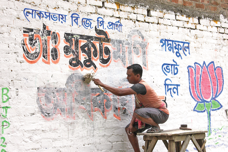 চুনকাম: মুছে ফেলা হচ্ছে রানাঘাটে বিজেপির আগের প্রার্থী মুকুটমণি অধিকারীর নাম। শান্তিপুরে। ছবি: প্রণব দেবনাথ