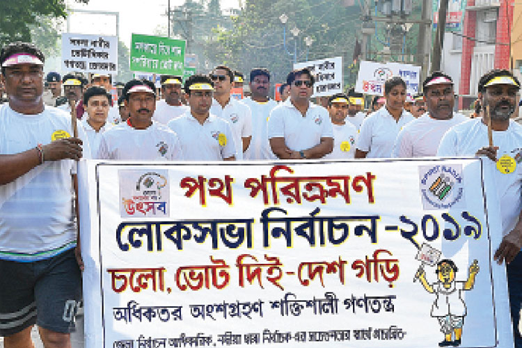 এর আগেও পরিবেশবান্ধব নয়, এমন ফ্লেক্সে নির্বাচন কমিশনের প্রচার দেখা গিয়েছিল জেলা প্রশাসনিক ভবন-সহ বহু জায়গায়। জেলাশাসক সুমিত গুপ্ত বলেছিলেন, তিনি নিজে খোঁজ নিয়ে দেখবেন, কেন এমনটা হল। অথচ তার পরেও মঙ্গলবার সকালে কৃষ্ণনগরের মানুষকে ভোট দানে উৎসাহিত করতে প্রশাসনের বার করা শোভাযাত্রায় দেখা গেল ফ্লেক্সের ব্যবহার। সেখানে উপস্থিত থাকলেন জেলা প্রশাসনের কর্তারাও। নতুন ভিভিপ্যাট যন্ত্র সম্পর্কে ভোটারদের সচেতন করতে ফ্লেক্স লাগানো যে ট্যাবলো নামানো হল, সেটির উদ্বোধন করলেন জেলাশাসক নিজেই।