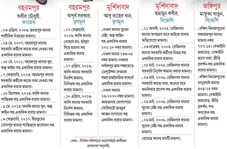 মুর্শিদাবাদ কেন্দ্রে তৃণমূলের প্রার্থী আবু তাহের খানের বিরুদ্ধেও খুনের চেষ্টা, অস্ত্র-আইন, ভাঙচুর করে আগুন লাগানো-সহ মোট তিনটি মামলা রয়েছে। বহরমপুরের কংগ্রেস প্রার্থী অধীর চৌধুরীর বিরুদ্ধে সাতটি মামলা রয়েছে। তার মধ্যে একটি মামলা বীরভূমের বোলপুর থানায়, বাকি মামলা মুর্শিদাবাদের বহরমপুর, জলঙ্গি, কান্দি ও ভরতপুর থানায় হয়েছে। ২০১১ সালে বহরমপুরে একটি খুন ও অস্ত্র আইনের মামলায় অধীর চৌধুরীর বিরুদ্ধে মামলা হয়েছে। ২০১৪ সালে জলঙ্গি থানায় খুন ও অস্ত্র আইনে মামলা হয়েছে তাঁর বিরুদ্ধে। এ ছাড়া সরকারি কাজে বাধা দেওয়া, শান্তিভঙ্গে প্ররোচনা দেওয়ার মতোও মামলা রয়েছে।
