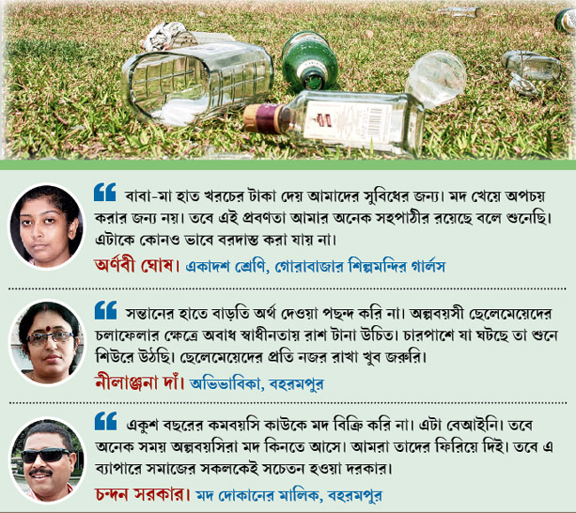 অভিযোগ উঠছে আবগারি দফতরের কোনও নজরদারি না থাকার কারণেই অল্পবয়সীদের হাতে অনায়াসে পৌঁছে যাচ্ছে মদের বোতল। মুর্শিদাবাদের আবগারি দফতরের আধিকারিক দেবাশিস বিশ্বাস বলছেন, ‘‘মদের দোকানে কমবয়সীদের মদ বিক্রির অভিযোগ পেলেই সেই দোকান মালিকের বিরুদ্ধে পদক্ষেপ করা হবে। গত মার্চ মাসেও আমরা এই অপরাধে একটি মদের দোকান এক মাস বন্ধ করে দিয়েছিলাম।’’