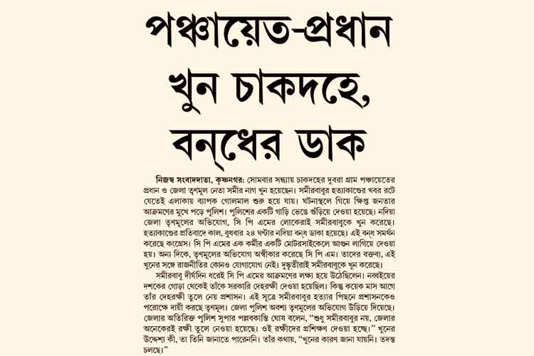 সে দিন সন্ধ্যায় পঞ্চায়েত অফিস থেকে দলের সভায় যাবেন বলে সবে বেরিয়েছিলেন। পরপর গুলির শব্দ। ছোটাছুটি, আতঙ্ক। খানিক পরে সকলে ছুটে এসে দেখেন, রক্তে মাখামাখি হয়ে পড়ে রয়েছেন চাকদহের দুবড়া গ্রাম পঞ্চায়েতের প্রধান সমীর নাগ। আততায়ীরা বেপাত্তা।