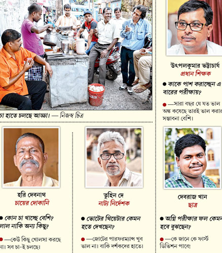 এর মধ্যে পাশে বিভাসের দোকান থেকে তিনটে দুধ আর দশটা লিকার চা আসে। পোস্ট অফিসের ভিতরের ঠেকে লোক বাড়ে, উত্তেজনাও। চড়া রোদ। তার ভিতরেই কামিনী গাছের ছায়ায় ঠেক। তর্ক শুনে দাঁড়িয়ে পড়েছিলেন এক ডাক কর্মী। কিছুটা শুনে মুখ বেঁকিয়ে বলে যান, ‘‘এরা‌ দেখছি আজই ঠিক করে দেবে কারা সরকার গড়ছে!’’