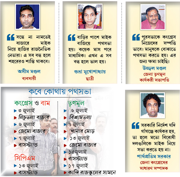 পুলিশ বলছে, চলতি মাসে গত বিশ দিনে সব মিলিয়ে ১৭টি পথসভা হয়েছে শহরে। হয়েছে, সাতটি মিছিল। তাদের মধ্যে বাম ও কংগ্রেস জোটের সাতটি। তৃণমূলে পুরসভা সংক্রান্ত তিনটি আর ২১জুলাই সংক্রান্ত সাতটি।