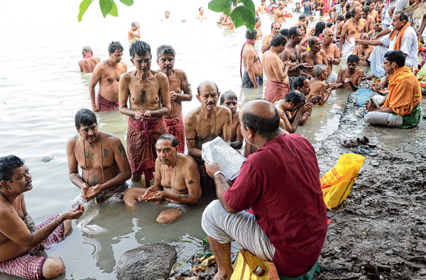 গঙ্গার পাড়ে আদুল গায়ে, ভেজা শরীরে, পরনে দুধসাদা ধুতি গলায় গামছা জড়িয়ে জলে পা ডুবিয়ে বসে আছেন কত মানুষ। তাঁদের হাতে ধরা তামার কুশি। তার মধ্যে জলে ডুবে যব, তিল, গঙ্গামাটি, ফুল, বেলপাতা তুলসী। সৈয়দাবাদের ষাটোর্ধ্ব মুরারী মণ্ডল বলেন, ‘‘পুরোহিত মন্ত্রোচ্চারণ করবেন আর সেই মতো পিতৃতর্পণ হবে, এটাই ছিল বিধান। তবে এখন অনেকে মাতৃতর্পণও করেন।’’ সেই দলে আছেন বড়়ঞার বিএ পাশ যুবক কুন্তল ভট্টাচার্যেরা তিন ভাই। কয়েক বছর ধরে বহরমপুরে গঙ্গায় তাঁরা বাবা-মা দু’জনের উদ্দেশ্যেই তিল-জল-তণ্ডুল দিয়ে আসছেন। কুন্তলের কথায়, ‘‘দেবী দুর্গার তো জগজ্জননী। তাঁর আগমনের আগে পিতৃতর্পণ হবে আর মাতৃতর্পণ হবে না? তা আবার হয় নাকি!’’ উল্টো দিকে, মহিলারা যে তর্পণ করতে পারেন, তা মানেন না গোঁড়া হিন্দুদের একটা অংশ। তাঁদের শাস্ত্রকে তুড়ি মেরে প্রতি বছর তর্পণ করে আসছেন বহরমপুরের অরুণা গুহ। অবসরপ্রাপ্ত নার্স অরুণার যুক্তি, ‘‘উত্তর থেকে দক্ষিণ ভারতের বহু মন্দিরে-ধামে গিয়েছি। সব জায়গায় কিন্তু শাস্ত্রের দোহাই দিয়ে মহিলাদের বঞ্চিত করা হয় না।’’