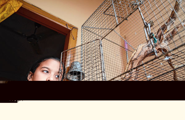 খাঁচার গায়ে আঙুল ছুঁইয়ে মেয়েটি বলছে—