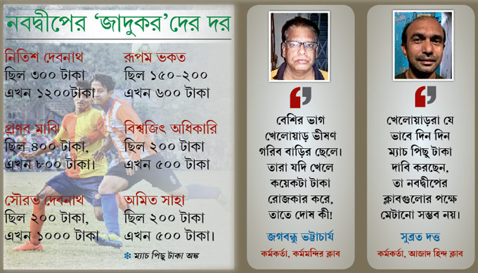নবদ্বীপ স্পোর্টস অ্যাসোসিয়েশনের সহ-সম্পাদক লাল্টু ভুঁইয়া বলেন, “টুর্নামেন্টে খেলতে হয় গোটা সাতেক ম্যাচ। আর লিগের খেলা মানে দশ-বারোটা ম্যাচ। দলের সংখ্যা যত বেশি হবে ততই বাড়বে খেলার সংখ্যা।’’ নবদ্বীপে এমন ফুটবল ক্লাবের সংখ্যা এখন নয় নয় করে ৫৫টি। ক্লাবকর্তারা জানাচ্ছেন পাল্লা দিয়ে বেড়েছে প্লেয়ারদের দরও। যে ছেলেটি দু’বছর আগেও ম্যাচ পিছু ২০০ বা ৩০০ টাকায় খেলে গিয়েছে, সে এ বার সাতশোর নিচে বলে পা দিতে চাইছেন না। আর পুরো লিগের জন্য চুক্তি করলে অন্তত দশ হাজার।