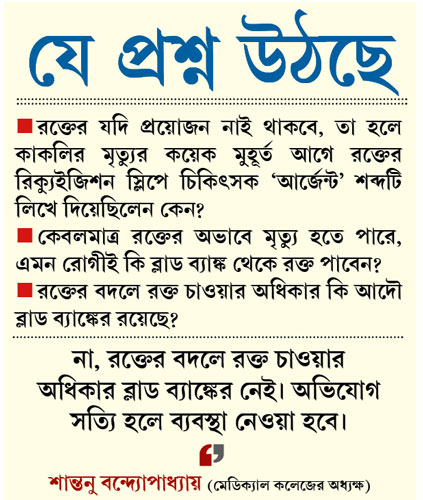 কাকলিদেবীর বাড়ির লোকেরা জানিয়েছেন, ভর্তি করার সঙ্গে সঙ্গেই তাঁদের থেকে চিকিৎসকরা রক্ত চেয়েছিলেন। এবং বারবার রক্ত তলব করেছিলেন বলেই তাঁরা পাগলের মতো ছোটাছুটি করেছিলেন। প্রশ্ন উঠছে, রক্তের যদি প্রয়োজন নাই থাকবে, তা হলে কাকলির মৃত্যুর কয়েক মুহূর্ত আগে রক্তের রিক্যুইজিশন স্লিপে চিকিৎসক ‘আর্জেন্ট’ শব্দটি লিখে দিয়েছিলেন কেন? আরও প্রশ্ন উঠছে যে, কেবলমাত্র রক্তের অভাবে মৃত্যু হবে এমন রোগীই কি ব্লাড ব্যাঙ্ক থেকে রক্ত পাবেন? রক্তের বদলে রক্ত চাওয়ার অধিকার ব্লাড ব্যাঙ্কের রয়েছে কি না, সেই প্রশ্নও উঠছে। শান্তনুবাবু বলেন, ‘‘না, তেমন অধিকার ব্লাড ব্যাঙ্কের নেই। এমন অভিযোগ নজরে এলে ব্যবস্থা নেওয়া হবে।’’