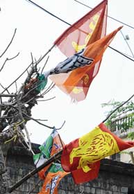 একাকার হয়ে গিয়েছে নানা দলের পতাকা। গৌতম প্রামাণিকের তোলা ছবি।