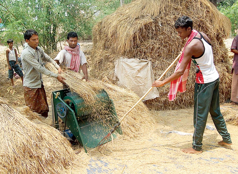মাঠে ধান ঝাড়ছে সুজন মাল। নিজস্ব চিত্র