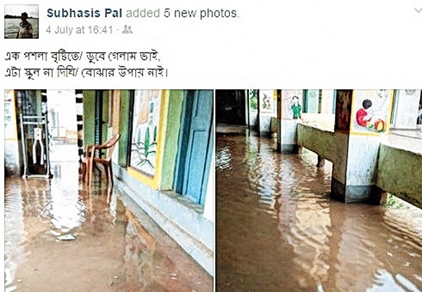 গত মঙ্গলবারই যেমন, এক টানা বৃষ্টিতে কার্যত ডুবে যায় স্কুল চত্বর। এ দিকে, ওই জল-ছবি সোশ্যাল মিডিয়ায় পোস্ট হতে না হতেই ‘লাইক’ ও ‘কমেন্ট’-এর ছড়াছড়ি। সোশ্যাল মিডিয়ায় ছবিটি পোস্ট করেছিলেন খোদ ওই প্রাথমিক স্কুলের প্রধান শিক্ষক শুভাশিস পাল। উপরে লিখেছিলেন— ‘‘এক পশলা বৃষ্টিতে/ ডুবে গেলাম ভাই, এটা স্কুল না দিঘি/ বোঝার উপায় নাই।’’ পাল্টা মন্তব্য পড়তে থাকে দ্রুত। কেউ লিখেছেন, ‘‘আজকের পরে স্কুলের নাম হল— লালবাগ দিঘি প্রাইমারি স্কুল।’’ কেউ আবার লিখেছেন, সামনের রাস্তা উঁচু করার জন্যই এই অবস্থা।
