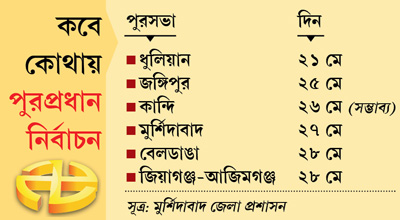 সম্প্রতি মুর্শিদাবাদ জেলা প্রশাসন বিজ্ঞপ্তি জারি করে জানিয়েছে, আগামী ২১ মে ধুলিয়ান, ২৫ মে জঙ্গিপুর, ২৭ মে মুর্শিদাবাদ, ২৮ মে জিয়াগঞ্জ-আজিমগঞ্জ ও বেলডাঙা এবং ২৬ মে (সম্ভাব্য) কান্দি পুরসভার পুরপ্রধান নির্বাচন হতে পারে।
