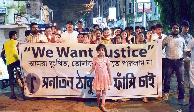 বিচার চেয়ে: নির্যাতিত শিশুকন্যার মৃত্যুতে পুরুলিয়া শহরের পথে মোমবাতি মিছিল। শুক্রবার। নিজস্ব চিত্র