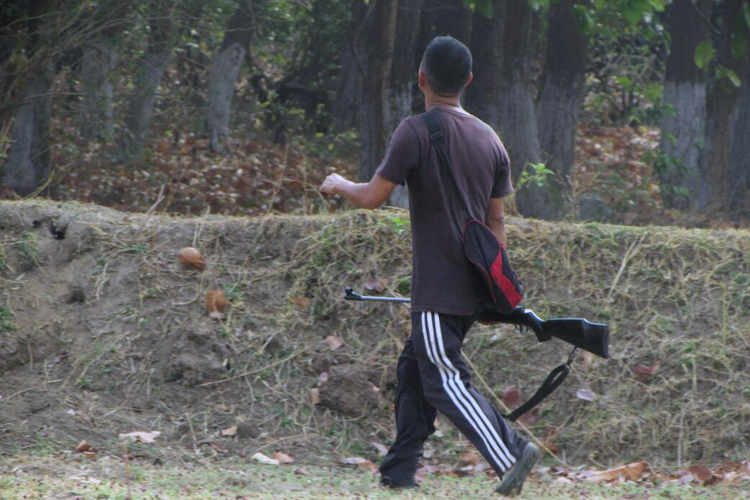 বাঘমুণ্ডির জঙ্গলে এয়ারগান হাতে শিকারের খোঁজে নাগা জওয়ান — নিজস্ব চিত্র।