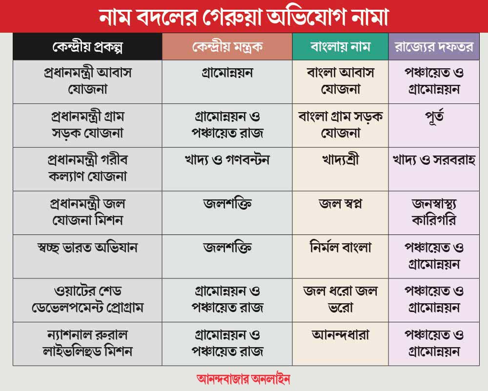 বিজেপির অভিযোগ, মোট সাতটি কেন্দ্রীয় প্রকল্পের নাম বদল করেছে রাজ্য সরকার। ‘প্রধানমন্ত্রী আবাস যোজনা’-র নাম হয়েছে ‘বাংলা আবাস যোজনা’। ‘প্রধানমন্ত্রী গ্রাম সড়ক যোজনা’-র নাম হয়েছে ‘বাংলা গ্রাম সড়ক যোজনা’। এ ছাড়াও ‘প্রধানমন্ত্রী গরিব কল্যাণ যোজনা’-র নাম ‘খাদ্যশ্রী’, ‘প্রধানমন্ত্রী জল যোজনা মিশন’-এর নাম রাজ্যে হয়েছে ‘জলস্বপ্ন’। এ ছাড়াও ‘স্বচ্ছ ভারত অভিযান’, ‘ওয়াটার শেড ডেভেলপমেন্ট প্রোগ্রাম’ এবং ‘ন্যাশনাল রুরাল লাইভলিহুড মিশন’-কে রাজ্যে ‘নির্মল বাংলা’,‘ জল ধরো-জল ভরো’ এবং ‘আনন্দধারা’ নামে চালানো হচ্ছে বলেও অভিযোগ।