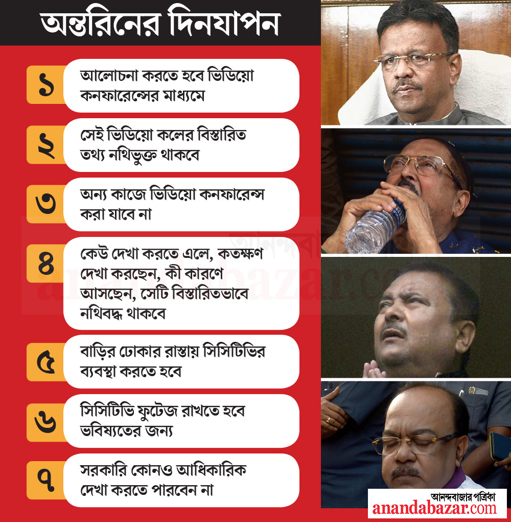 রাজ্যের নেতা-মন্ত্রীর আইনজীবী জানিয়েছিলেন, তাঁদের সরকারি কাজ করতে দেওয়া হোক। করোনা পরিস্থিতিতে কাজ করার বিষয়ে আংশিক অনুমতি দিয়ে আদালত জানিয়েছে, সব কাজই করতে হবে অনলাইনে। অনলাইনে ফাইল দেওয়া নেওয়া হবে, আলোচনা করতে হবে ভিডিয়ো কনফারেন্সিংয়ের মাধ্যমে। সরকারি কোনও আধিকারিক দেখা করতে পারবেন না। সেই ভিডিয়ো কলের বিস্তারিত তথ্য নথিভুক্ত থাকবে। আর অন্য কাজে ভিডিয়ো কল করা যাবে না। কোনও বিশেষ দরকারে কেউ দেখা করতে এলে, কতক্ষণ দেখা করছেন, কী কারণে আসছেন, সেটি বিস্তারিতভাবে নথিবদ্ধ থাকবে। বাড়ির ঢোকার রাস্তায় যদি সিসিটিভি না থাকে, তাহলে তার ব্যবস্থা করতে হবে জেল কর্তৃপক্ষকে। কে আসছেন, যাচ্ছেন, সমস্ত নজরদারিতে রাখতে হবে। এই সিসিটিভি ফুটেজ রাখতে হবে ভবিষ্যতের জন্য।