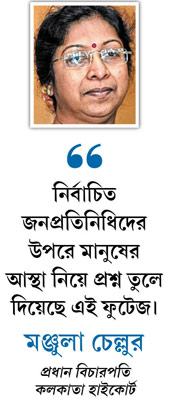কোনও রকম তদন্ত ছাড়াই মঙ্গলবারও মুখ্যমন্ত্রী রায় দিয়েছেন, নারদ নিউজের ঘুষ-ভিডিও জাল, তৃণমূলের বিরুদ্ধে চক্রান্ত। আর মঙ্গলবার কলকাতা হাইকোর্টের প্রধান বিচারপতি মঞ্জুলা চেল্লুর বলেন, ‘‘এই ফুটেজ জাল হলে তা যেমন সমাজের পক্ষে বিপজ্জনক, আবার খাঁটি হলেও তাই। নির্বাচিত জনপ্রতিনিধিদের উপর মানুষের আস্থা নিয়েই প্রশ্ন তুলে দিয়েছে এই ফুটেজ। জনমানসেও প্রভাব ফেলেছে। সেই কারণেই এই ফুটেজের ফরেন্সিক পরীক্ষা হওয়া উচিত।’’