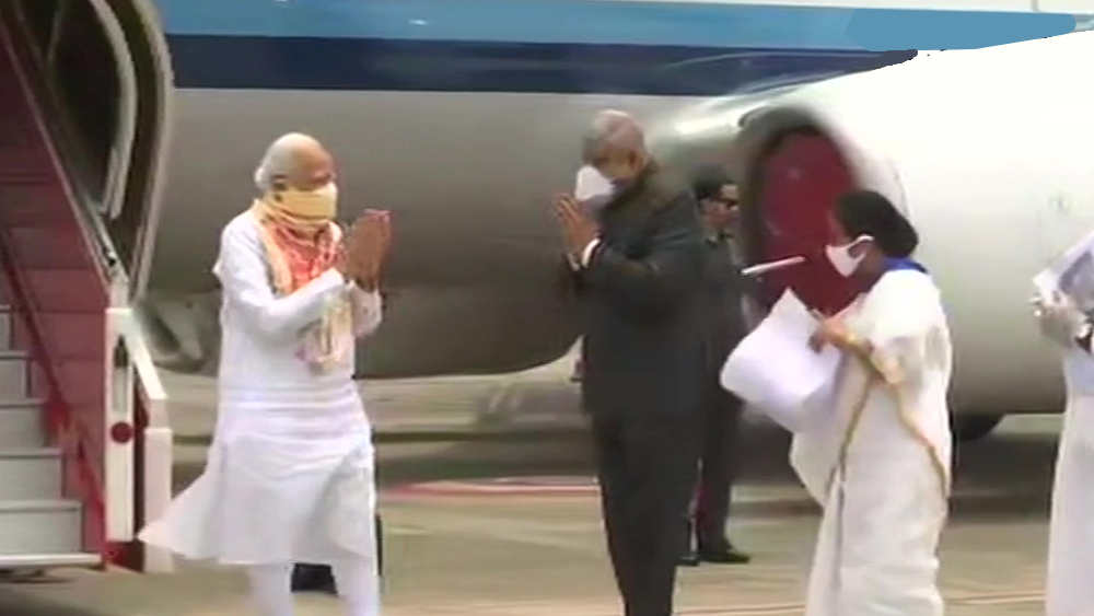 কলকাতা বিমানবন্দরে প্রধানমন্ত্রী নরেন্দ্র মোদীকে স্বাগত জানালেন রাজ্যপাল জগদীপ ধনখড় এবং মুখ্যমন্ত্রী মমতা বন্দ্যোপাধ্যায়। ছবি: সংগৃহীত।