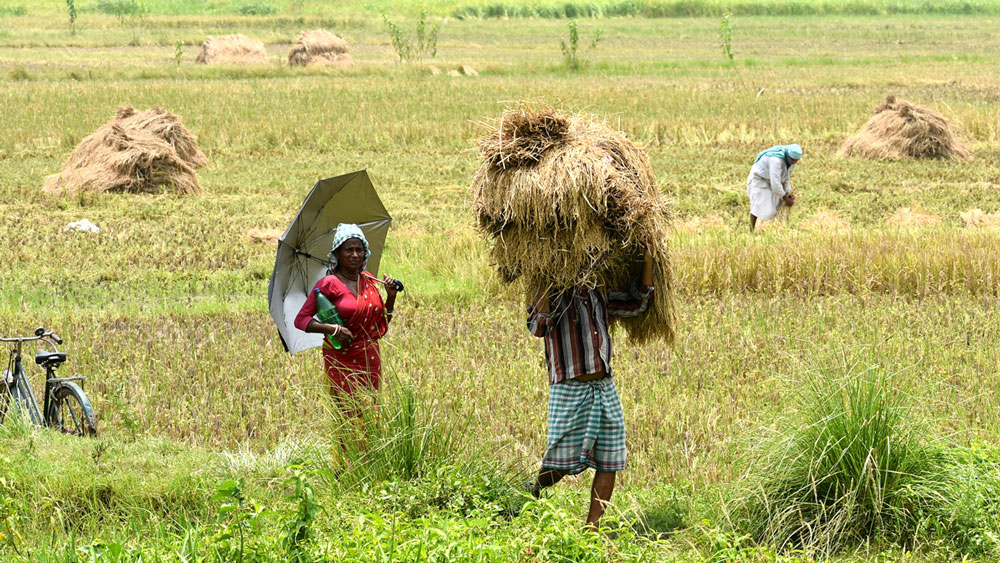 আসছে আমফান। তার আগেই মাঠ থেকে পাকা ধান ঘরে তোলার তোড়জোড়। রবিবার পাঁশকুড়ার জিয়াখালিতে। ছবি: কৌশিক সাঁতরা