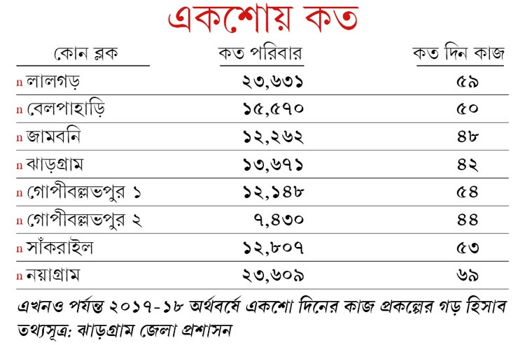 কেন্দ্রের শ্রম বাজেট অনুযায়ী, ঝাড়গ্রাম জেলায় ২০১৭-১৮ অর্থবর্ষে ৫১ লক্ষ ১২ হাজার শ্রমদিবস তৈরির লক্ষ্যমাত্রা ছিল। প্রশাসন সূত্রে দাবি, চলতি অর্থবর্ষে ঝাড়গ্রাম জেলায় ১ লক্ষ ২১ হাজার ১২৮টি পরিবারকে গড় প্রায় ৫৫ দিন কাজ দেওয়া গিয়েছে। এর মধ্যে জেলার ১৪ হাজার ৫১৬টি পরিবারকে পুরো একশো দিনই কাজ দেওয়া গিয়েছে বলে দাবি। ৬৬ লক্ষেরও বেশি শ্রমদিবস তৈরি করা গিয়েছে জেলায়। তাই একশো দিনের প্রকল্পের ওয়েবসাইট থেকে পঞ্চায়েত সমিতিগুলি নতুন কাজের অনুমোদন চেয়ে আবেদন করলেও বরাদ্দ মিলছে না বলে অভিযোগ।