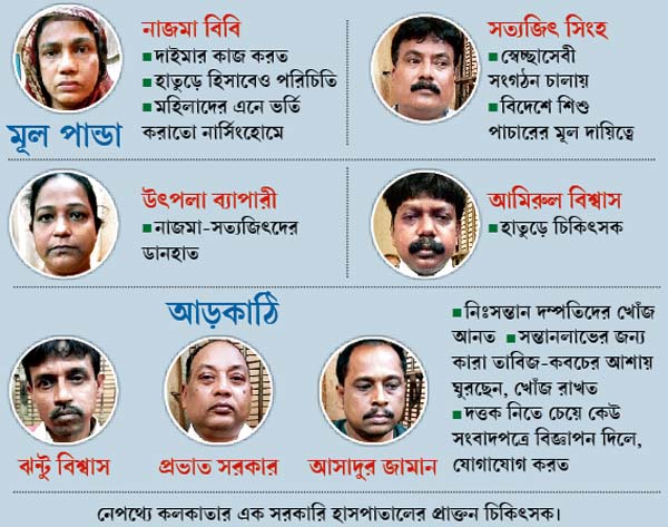 সিআইডির এডিজি রাজেশ কুমার বলেন, ‘‘ওই চক্রটি কোথায় কোথায় শিশু পাচার করেছে, কত দিন ধরে এই কাজ করছে, তা খতিয়ে দেখা হচ্ছে। এটি একটি বড় চক্র বলেই মনে হচ্ছে।’’ এক তদন্তকারীর কথায়, চক্রের মূল পান্ডা নাজমা ও সত্যজিৎ সিংহ। সত্যজিৎ একটি স্বেচ্ছাসেবী সংস্থা চালায়। নার্সিংহোমের মালিক বাগবুল বৈদ্য, হাতুড়ে চিকিৎসক আমিরুল বিশ্বাস ছাড়াও এই চক্রে রয়েছে প্রভাত সরকার, ঝন্টু বিশ্বাস, আসাদুর জামান, উৎপলা ব্যাপারী। সকলেই ধরা পড়েছে। পাচার চক্রে সরকারি হাসপাতালের এক প্রাক্তন চিকিৎসকও জড়িত বলে জানিয়েছেন ডিআইজি সিআইডি ভরতলাল মিনা। তবে তাকে এখনও গ্রেফতার করা হয়নি।
