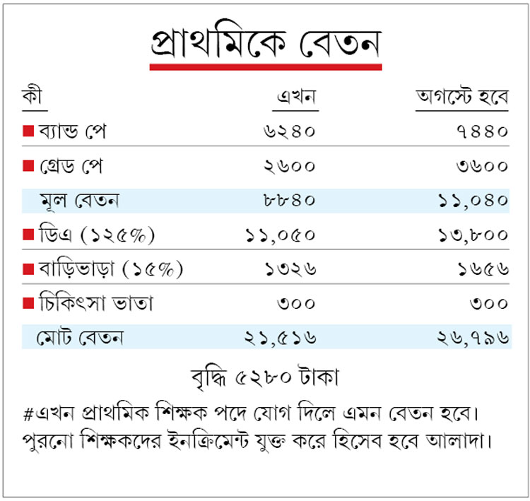 এত দিন প্রাথমিক শিক্ষকদের গ্রেড পে ছিল ২৬০০ টাকা। মূল বেতনের ব্যান্ড পে ছিল ৬২৪০ টাকা থেকে। অগস্ট থেকে ব্যান্ড পে হবে ৭৪৪০ টাকা। অর্থ দফতরের হিসেব অনুযায়ী সদ্য চাকরিতে যোগ দেওয়া প্রাথমিক শিক্ষকদের বেতন ২১,৫১৬ টাকা থেকে বেড়ে ২৬,৭৯৬ টাকা হবে। বেতন বাড়বে ৫২৮০ টাকা।