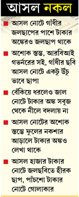 এক গোয়েন্দা অফিসারের কথায়, ‘‘ওই সব নোটের মান খুব ভাল। এমনকী, আসল নোটের বেশ কয়েকটি সুরক্ষা-বৈশিষ্ট্যও জাল নোটে ঢুকে পড়েছে। নোটে নখ দিয়ে টোকা মারলে ‘ঠং ঠং’ আওয়াজ হচ্ছে, গাঁধীজির জলছবিও রয়েছে।’’ ওই অফিসার বলেন, ‘‘তবে নোট উল্টো করে ধরলেও টাকার অঙ্ক রং বদলাচ্ছে না। হাজার টাকার নোটে হীরকাকৃতির ছাপ আর পাঁচশো টাকার নোটে গোলাকার ছাপও নেই। এগুলো এখনও নকল করা যায়নি। বাংলাদেশের পুলিশকে এই সবের পাঠই দিতে হবে।’’