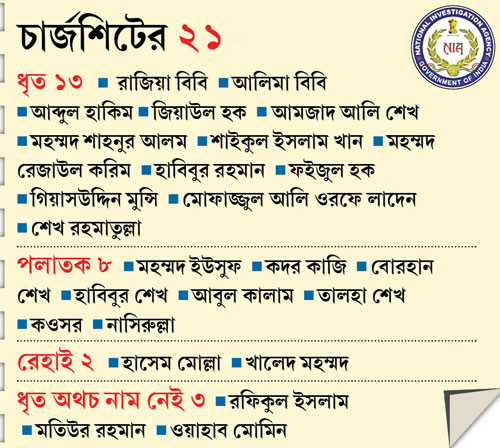 কিন্তু অক্টোবরে ধৃত রফিকুলের নাম চার্জশিটে নেই কেন? বিশেষ করে তার সঙ্গেই অসমের আর যে দু’জনকে হেফাজতে পেয়ে কলকাতায় নিয়ে এসেছিল এনআইএ, সেই শাহনুর আলম ও শাইকুল ইসলামের নাম কিন্তু অভিযুক্তদের তালিকায় রয়েছে! আবার গত ২৮ জানুয়ারি নদিয়ার মির্জাপুর গ্রামের গিয়াসউদ্দিন মুন্সি ও মতিউর রহমানকে এক সঙ্গে গ্রেফতার করা হয়। চার্জশিটে কিন্তু মতিউরের নাম নেই।