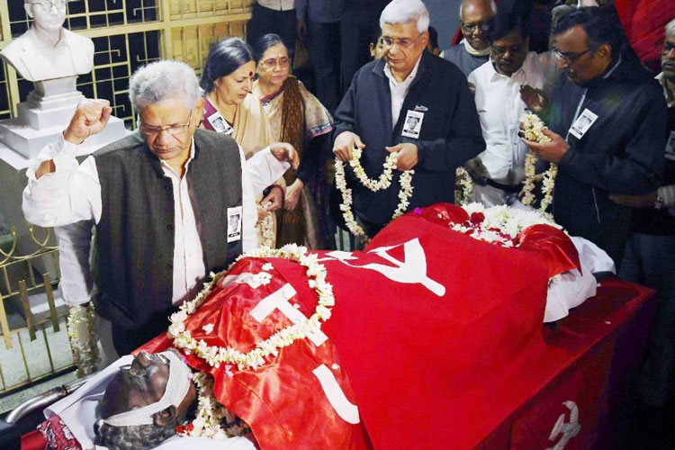 আলিমুদ্দিনে প্রয়াত নেতার দেহ লাল পতাকায় মুড়ে শ্রদ্ধা জানাচ্ছেন সীতারাম ইয়েচুরি, প্রকাশ ও বৃন্দা কারাট, সূর্যকান্ত মিশ্র, বিমান বসু।