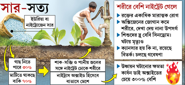 বিশ্বপতিবাবু জানাচ্ছেন, সারের নাইট্রোজেনের ৩০% গাছ নিতে পারে। শাক-সব্জি-ফলের মাধ্যমে তা নাইট্রেট আকারে শরীরে ঢুকছে। পরে যা নাইট্রাইটে পরিণত হচ্ছে। বাকি ৭০%-এর একটা বড় অংশ নাইট্রেট রূপে ভূগর্ভস্থ জলে গিয়ে মিশছে। মাটির নীচ থেকে তোলা পানীয় জলের সঙ্গে সেই নাইট্রেটও আমাদের শরীরে প্রবেশে করছে। বিশ্ব স্বাস্থ্য সংস্থা হু-র রিপোর্ট অনুযায়ী পানীয় জলে নাইট্রেটের সহনশীলতার মাত্রা প্রতি লিটারে ৫০ মিলিগ্রাম। ভারতের মতো উন্নয়নশীল দেশগুলির পানীয় জলে এর পরিমাণ অনেক বেশি।