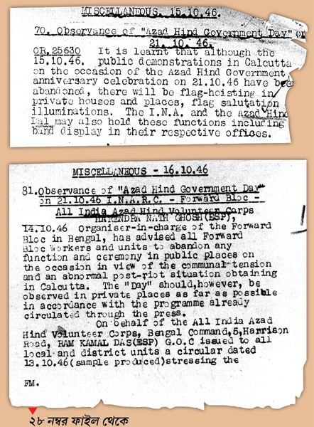 তা হলে ইঙ্গিত মিলল কীসে? একটি ফাইলের নথি বলছে, ১৯৪৮ সালের ৫ মার্চ নয়াদিল্লির তথ্য ও সম্প্রচার দফতরের চিনা কর্মী চৌ হুয়াও কুং অমিয়নাথ বসুকে চিঠি লিখছেন, ‘‘আমি এখনও বিশ্বাস করি, উনি বেঁচে আছেন।’’ কিন্তু বিশ্বাসের উল্টো দিকে অন্য তথ্যও রয়েছে। ওই ফাইলেই আছে, ১৯৪৭ সালের ১৬ নভেম্বর নিমতলাঘাট স্ট্রিটের কাছে সুভাষচন্দ্রের মূর্তি উদ্বোধন হচ্ছে। আজাদ হিন্দ বাহিনীর শাহনওয়াজ খান সেই মূর্তিকে স্যালুট করেছেন, শহীদদের স্মরণে সমবেত জনতা দু’ মিনিট নীরবতা পালন করেছে। ২৮ নম্বর ফাইলে বলা হচ্ছে, ১৯৪৬ সালে কলকাতায় আজাদ হিন্দ দিবসে সুভাষের ছবিতে মালা পরিয়ে মিছিল করা হল। শহরের বিভিন্ন প্রান্তে বাজিয়ে শোনানো হল তাঁর তিন বছর আগের বক্তৃতা। পারিপার্শ্বিক সাক্ষ্যপ্রমাণ বলা যেতে পারে। মারা না-গেলে মাল্যদান বা শহিদ স্মরণে নীরবতা পালন হতে যাবে কেন?
