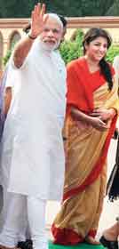 দক্ষিণেশ্বরের মন্দিরে প্রধানমন্ত্রীর সঙ্গে লকেট চট্টোপাধ্যায়। ছবি: সুদীপ আচার্য।