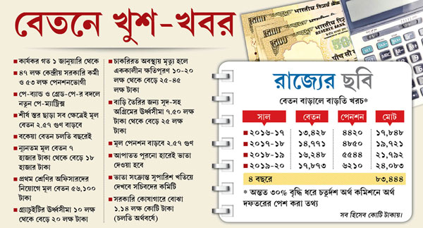 প্রশাসনের এক শীর্ষ কর্তার ব্যাখ্যা: পঞ্চম বেতন কমিশনের সুপারিশ মানতে গিয়ে এক ধাক্কায় বেতন খাতে ৫৮.৯২% ও পেনশন খাতে ৪৬.৮৭% খরচ বেড়েছিল রাজ্যের। সামাল দিতে তৎকালীন অর্থমন্ত্রী বাজার থেকে ঋণ নিয়েছিলেন। আগের সরকার ২০০৮-এ যেখানে ৩৩ হাজার কোটি টাকা ঋণ নিয়েছিল, বর্ধিত বেতনের চাপ মোকাবিলায় পরবর্তী দু’ছরে দেনার বহর বেড়ে প্রায় ৬০ হাজার কোটিতে পৌঁছয়।