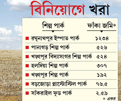 প্রশাসন সূত্রের খবর, হাওড়ার অঙ্কুরহাটিতে জেমস-জুয়েলারি পার্ক ছাড়া শিল্পোন্নয়ন নিগম গত চার বছরে আর কোনও শিল্পতালুক তৈরি করতে পারেনি। কোথাও কোথাও বাম জমানায় তৈরি হওয়া শিল্পতালুকের সম্প্রসারণ করা হয়েছে মাত্র। ওই সব তালুকে শিল্প গড়ার আহ্বান জানিয়ে বার কয়েক বিজ্ঞাপন দেওয়া হলেও লগ্নি আসেনি। তাই মালদহের ফুড পার্কে বিনিয়োগ না-আসাটা ব্যতিক্রম হিসাবে দেখছেন না শিল্প দফতরের কর্তারা। এর মধ্যে বোলপুরের তালুকে শিল্প না-আসায় সেখানে আবাসন গড়ার কথা ঘোষণা করেছেন মুখ্যমন্ত্রী।