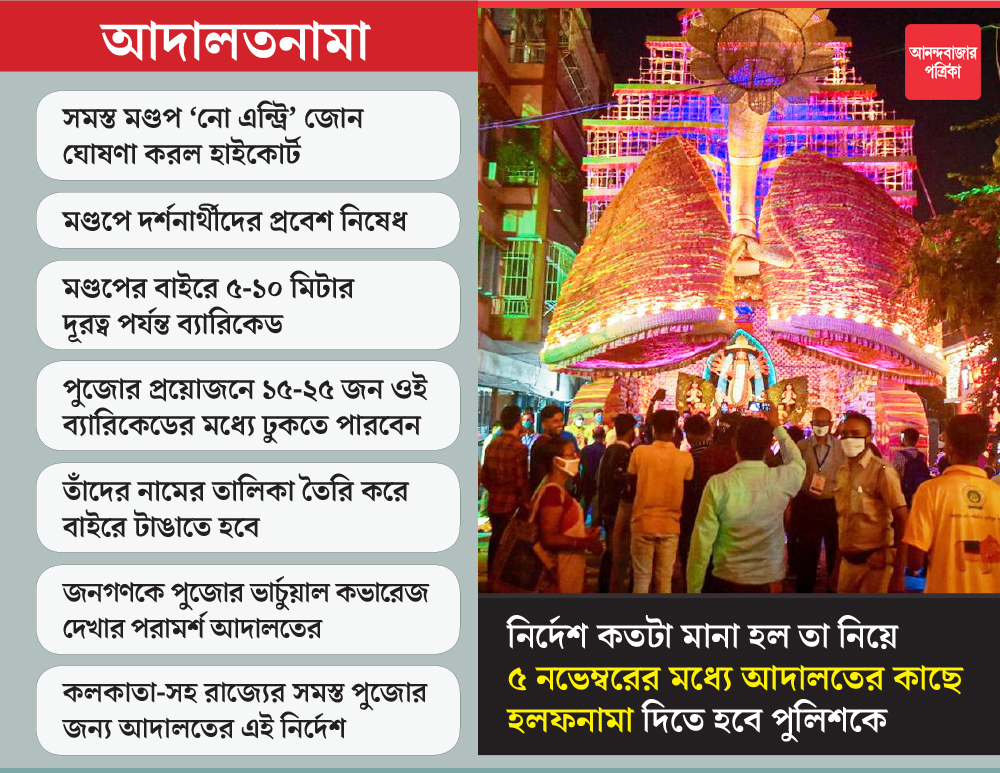 রাজ্যের সমস্ত পুজো প্যান্ডেলে দর্শকদের ঢোকার ক্ষেত্রে নিষেধাজ্ঞা জারি করল কলকাতা হাইকোর্ট। অতিমারি পরিস্থিতিতে আদৌ পুজো করার অনুমতি দেওয়া সঙ্গত কি না তা নিয়ে হাইকোর্টে মামলা দায়ের হয়। সেই মামলায় সোমবার হাইকোর্ট রাজ্যের সমস্ত পুজো প্যান্ডেলকে ‘নো এন্ট্রি’ জোন হিসাবে ঘোষণা করার নির্দেশ দিয়েছে। আদালতের নির্দেশ কী ভাবে এবং কতটা মানা হল, তা হলফনামা হিসাবে লক্ষ্মীপুজোর পর আদালতকে জানাতে হবে রাজ্যকে। রাজ্য পুলিশের ডিজি এবং কলকাতার পুলিশ কমিশনারকে ওই আগামী ৫ নভেম্বরের মধ্যে ওই হলফনামা জমা দিতে নির্দেশ দিয়েছে আদালত।