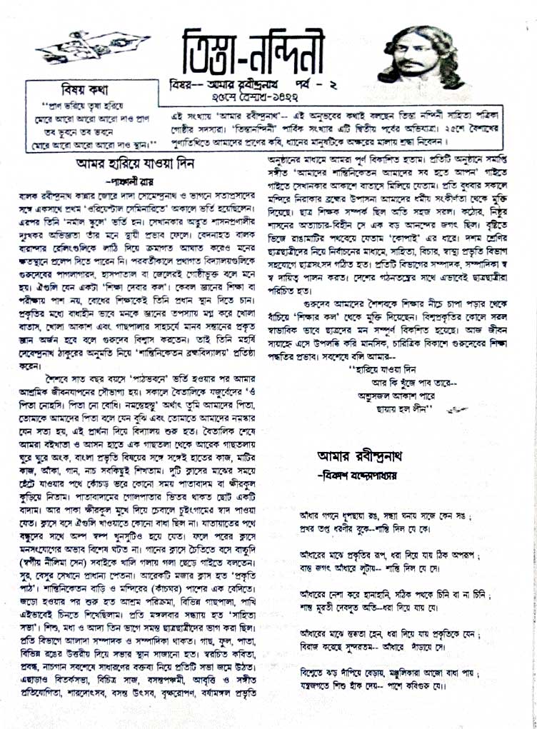 শুধু সাংস্কৃতিক অনুষ্ঠান এবং আলোচনা নয়। জলাপাইগুড়ির ‘তিস্তানন্দিনী’রা ২৫ বৈশাখ রবীন্দ্রনাথকে অনুভব করলেন অক্ষরমালাতেও। অক্ষরে কেউ গাঁথলেন, ‘তাঁরই সঙ্গে যাপিত হোক আমার বাকি আয়ুষ্কালটুকু’, কেউ লিখলেন চিঠি, ‘একটি মানুষ আমার সেতারেতে তার বেঁধেছিল, সে তুমি, রবিঠাকুর’। কেউ জানালেন, ‘আমি একদিন, তুমি প্রতিদিন’, কেউ পাঠালেন পত্রসংবাদ, ‘রানু ও রবীন্দ্রনাথ’। কাজের অনুভবে তিনি, ‘আমার রবীন্দ্রনাথ’, কারওবা ‘আমার মধ্যে তোমার প্রকাশ’। অনুভব-অক্ষরমালার সমাপ্তি, ‘রবীন্দ্রনাথ’এ। সেই মালায় ‘তিস্তানন্দিনী’দের অজস্র অক্ষরগুচ্ছ যত্নে গেঁথে দিয়েছেন দেবযানী সেনগুপ্ত।