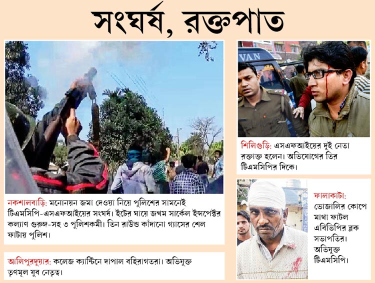 এ দিন লকশালবাড়িতে মনোনয়ন পত্র জমা দেওয়া নিয়ে পুলিশের সামনেই টিএমসিপি এবং এসএফআইয়ের সংঘর্ষ হয়। সকালেই পুলিশের সামনে দু’পক্ষ বাঁশ, পাথর এবং ইঁট নিয়ে জড়ো হতে থাকে। স্থানীয় বাসিন্দাদের অভিযোগ, কোনও পক্ষকেই সকাল থেকে পুলিশ অফিসারেরা নিরস্ত করার চেষ্টা করেননি। তাই মনোনয়ন জমা দেওয়ার সময় শুরু হতেই সংঘর্ষ শুরু হয়ে যায়। টিএমসিপির সমর্থকেরা কলেজের গেটটিও ভেঙে ফেলে বলে অভিযোগ। পুলিশের দিকে ঢিল বৃষ্টি শুরু হয়। ইটের ঘায়ে জখম হন সার্কেল ইন্সপেক্টর কল্যাণ গুরুঙ্গ-সহ ৩ জন পুলিশকর্মী। পুলিশ তিন রাউন্ড কাঁদানো গ্যাসের শেল ফাটানোর পর পরিস্থিতি কিছুটা স্বাভাবিক হয়। তবে এলাকার দখলকে ঘিরে বিকাল অবধি গোলমাল চলে বলে অভিযোগ। পুলিশ জানিয়েছে, উভয় পক্ষের অন্তত ১০ জন দখম হয়েছেন। এসএফআইয়ের দাবি, তাদের এক ছাত্রীর হাত ভেঙেছে। এক ছাত্রের পায়ে গুরুতর চোট লেগেছে। কয়েকজনকে নকলবাড়ি হাসপাতালে চিকিৎসা করানো হয়। টিএমসিপি’র জেলা সভাপতি নির্ণয় রায় বলেন, ‘‘বহিরাগতদের নিয়ে এসএফআই কলেজে মনোনয়ন জমা করতে গিয়েছিল। আমাদের ছাত্রদের উপর ওরা হামলাও চালিয়েছে।’’ এসএফআই-এর জেলা সম্পাদক সৌরভ দাসের পাল্টা অভিযোগ, ‘‘এ বারও জিতব বুঝতে পেরে পুলিশের একাংশ, বহিরাগতদের নিয়ে আমাদের উপর হামলা চালায় টিএমসিপি। আমাদের বহু মনোনয়নপত্র ছিঁড়ে দিয়েছে।’’ দার্জিলিঙের পুলিশ সুপার অমিত জাভালগি বলেন, ‘‘পুলিশ পর্যাপ্তই ছিল। বিভিন্ন দিক থেকে পুলিশকে লক্ষ করে ঢিল, ইট ছোড়া হয়েছে। পুলিশকর্মীরাই জখম হয়েছেন।’’ নকশালবাড়ি কলেজের অধ্যক্ষ সমীরেন্দ্র সরকার জানান, আজ, মঙ্গলবার বাড়তি পুলিশি নিরাপত্তা চাওয়া হয়েছে। এই কলেজের ২২ অাসনে এ দিন ৩৭টি মনোনয়ন জমা পড়েছে।
