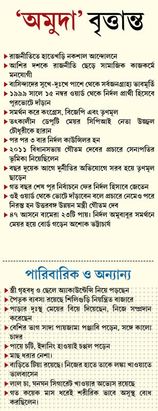এ বারের পুরভোটের অরবিন্দবাবু ওরফে শিলিগুড়ির প্রিয় অমুদার সমর্থনে শিলিগুড়িতে বোর্ড গঠন করে বামেরা। এই অমুদাই কিন্তু ২০১১ বিধানসভা নির্বাচনে তৃণমূলের গৌতম দেবের প্রচারে সেনাপতির ভূমিকা নিয়েছিলেন। দুর্নীতির অভিযোগে তৃণমূল ছেড়ে পুর নির্বাচনে নির্দল হিসাবে জিতেছিলেন। বামেরা ৪৭ আসনের মধ্যে ২৩টি পায়। নির্দল অমুবাবুর সমর্থনে মেয়র হয়ে বোর্ড গড়েন অশোক ভট্টাচার্য। অত্যন্ত সাধারণ জীবনযাপনে বিশ্বাসী অমুদা হঠাৎ অসুস্থ হয়ে পড়ায়, সকলেই উদ্বিগ্ন হয়ে পড়েন।