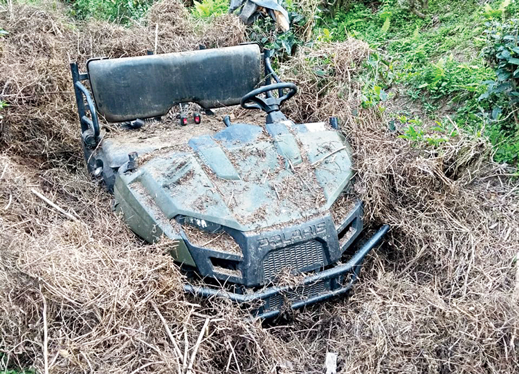 বিদেশি-বাহন: জঙ্গলের ঢালে খড় ঘাসে ঢাকা ছিল গুরুঙ্গের এই গা়ড়িটি