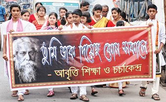 মালদহে রবীন্দ্রজয়ন্তীতে প্রভাতফেরি। ছবি: রাজা বন্দ্যোপাধ্যায়ের তোলা ছবি।