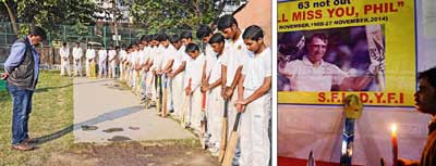শিলিগুড়ির অগ্রগামী ক্রিকেট প্রশিক্ষণ শিবিরের খেলোয়াড়েরা। ডান দিকে, এ দিনই হিউজের প্রতি শ্রদ্ধা