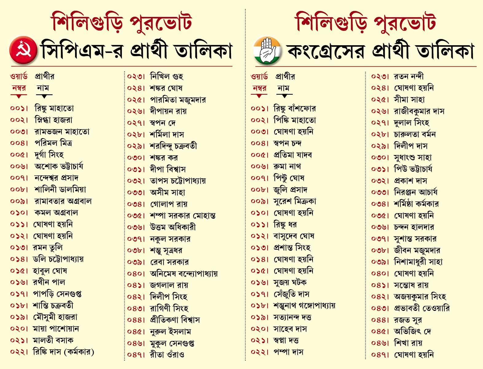এদিন বামেরা যে প্রার্থী তালিকা ঘোষণা করেছে, তাতে ১৯টি নতুন মুখে পাশাপাশি স্নিগ্ধা হাজরা, রামভজন মাহাতো, পরিমল মিত্র, নন্দেশ্বর প্রসাদ, শান্তি চক্রবর্তী, নিখিল গুহ, শঙ্কর কর, গোপাল রায়, রেবা সরকার বা অনিমেষ বন্দ্যোপাধ্যায়ের মতো পুরানো প্রাক্তন কাউন্সিলর-মেয়র পারিষদদের টিকিট দেওয়া হয়েছে। গত ভোটে এদের অনেককেই দল টিকিট দেয়নি। আবার টানাপড়েনের পর ৪৫ নম্বর ওয়ার্ড থেকে নুরুল ইসলামকে প্রার্থী করেছে সিপিএম। সদ্য প্রাক্তন কাউন্সিলরদের মধ্যে এক জনের মৃত্যু হয়েছে। সবিতা সাহা, রামেশ্বর প্রসাদ গুপ্তাকে টিকিট দেওয়া হয়নি। আর অমরনাথ সিংহের ওয়ার্ড সংরক্ষিত হওয়ায় তাঁর মেয়ে ভোটে দাঁড়িয়েছেন। দলের জেলা সম্পাদক জীবেশ সরকার বলেন, “এবার ভোটে অশোক ভট্টাচার্যই আমাদের মুখ। ওঁর নেতৃত্বেই আমরা শিলিগুড়িকে বাঁচান স্লোগান তুলে লড়াই করব। সেখানে প্রবীণ এবং নবীন দুইয়ের সমন্বয়ে তালিকা তৈরি হয়েছে।”